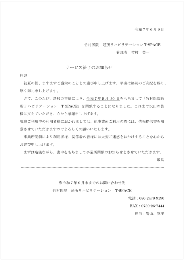 この度「竹村医院 通所リハビリテーション」は、諸般の事情により、 令和7年9月30日をもちまして閉鎖いたします。